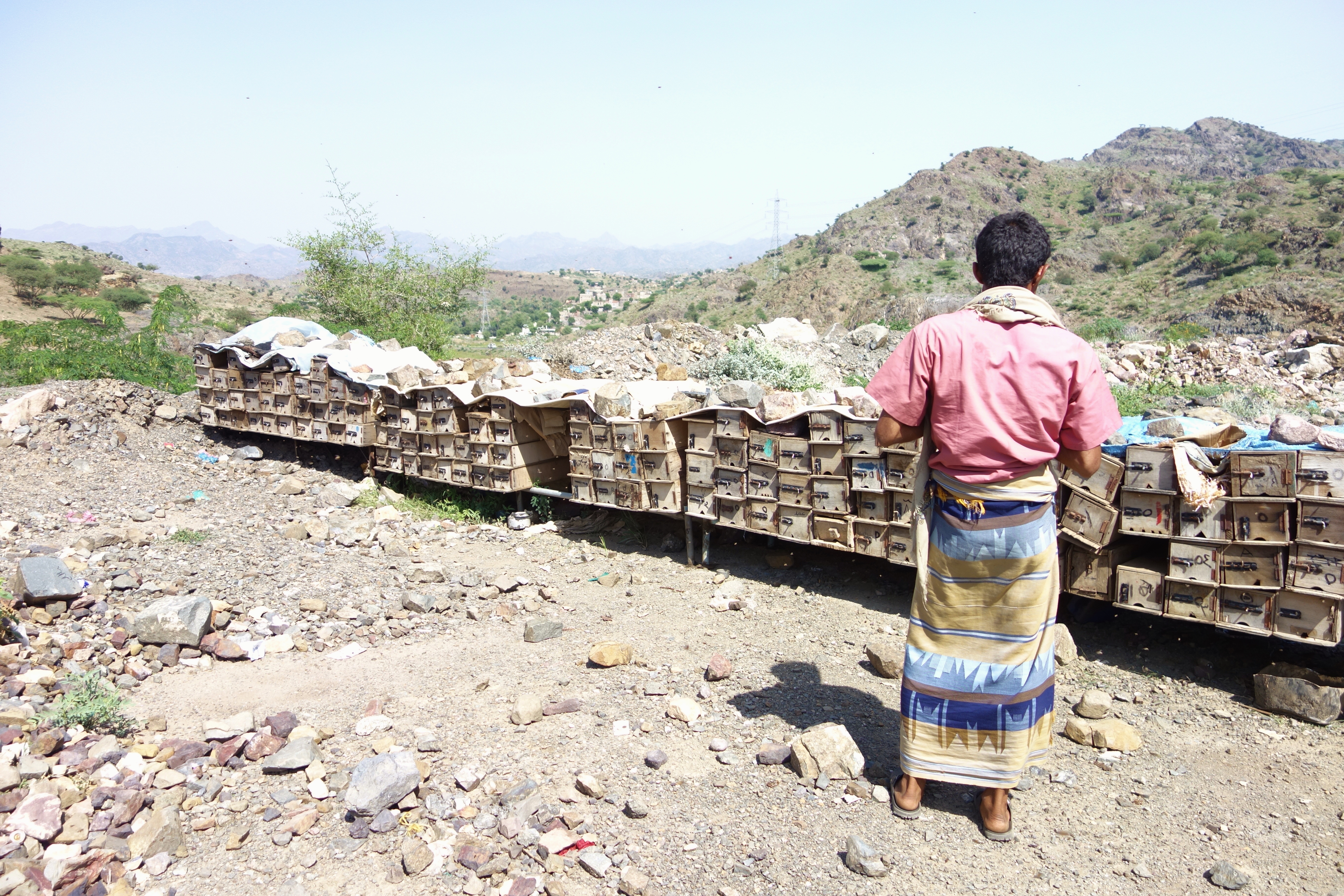 The process of raising bees and selling honey in Yemen is a little different (but most things are a little different in Yemen). Unlike everywhere else I am familiar with, where the bees are taken to the flowers, in Yemen, the flowers are taken to the bees. And the bees will be located next to a busy road where it will be the most convenient to sell the honey they produce.