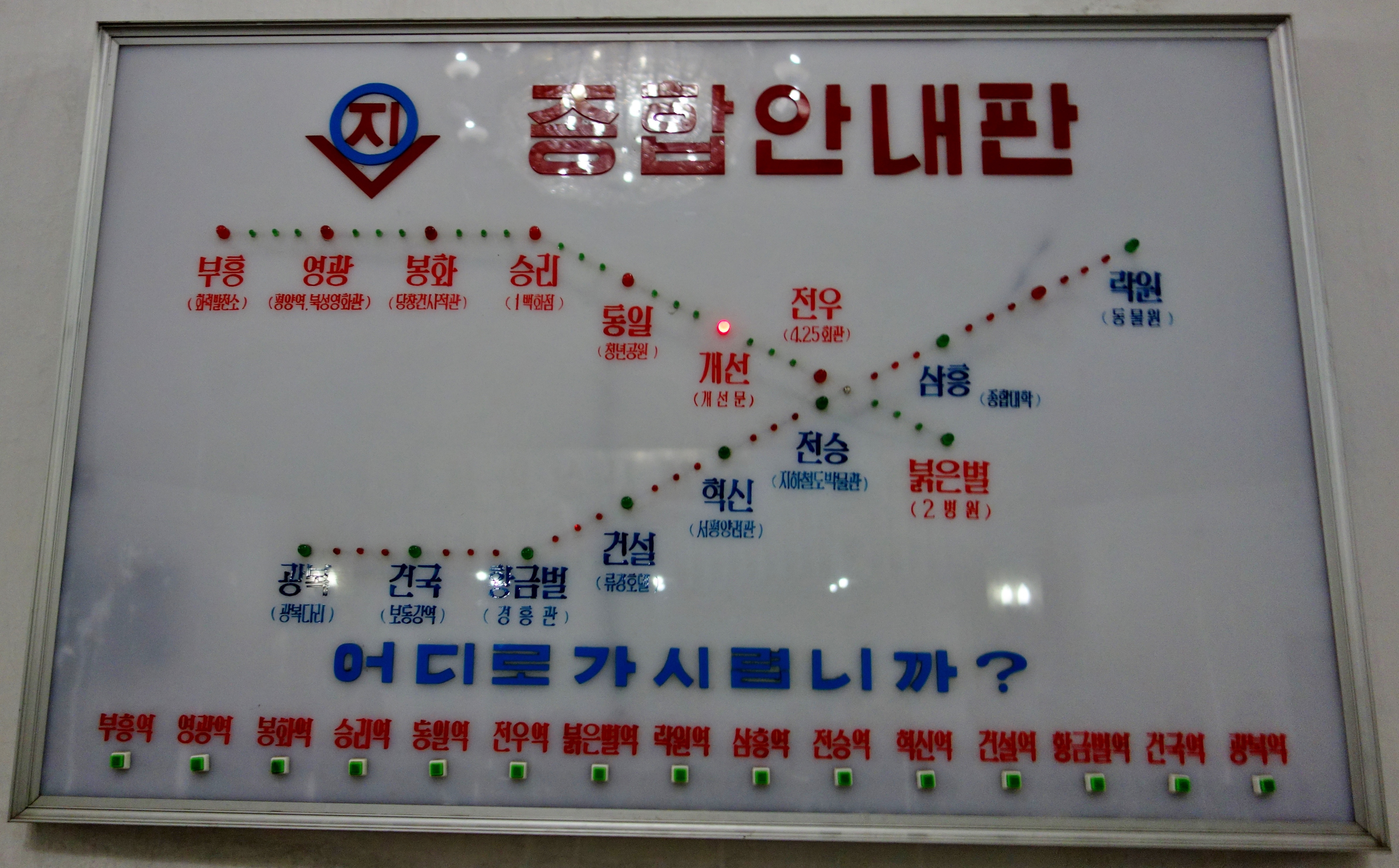 The train approaches… One common defense of Italian dictator Benito Mussolini is that he “made the trains run on time.” The Kim family could also fall back on this defense as, at least on the occasions when we rode the Pyongyang Metro, the trains were always punctual at about four minutes apart: