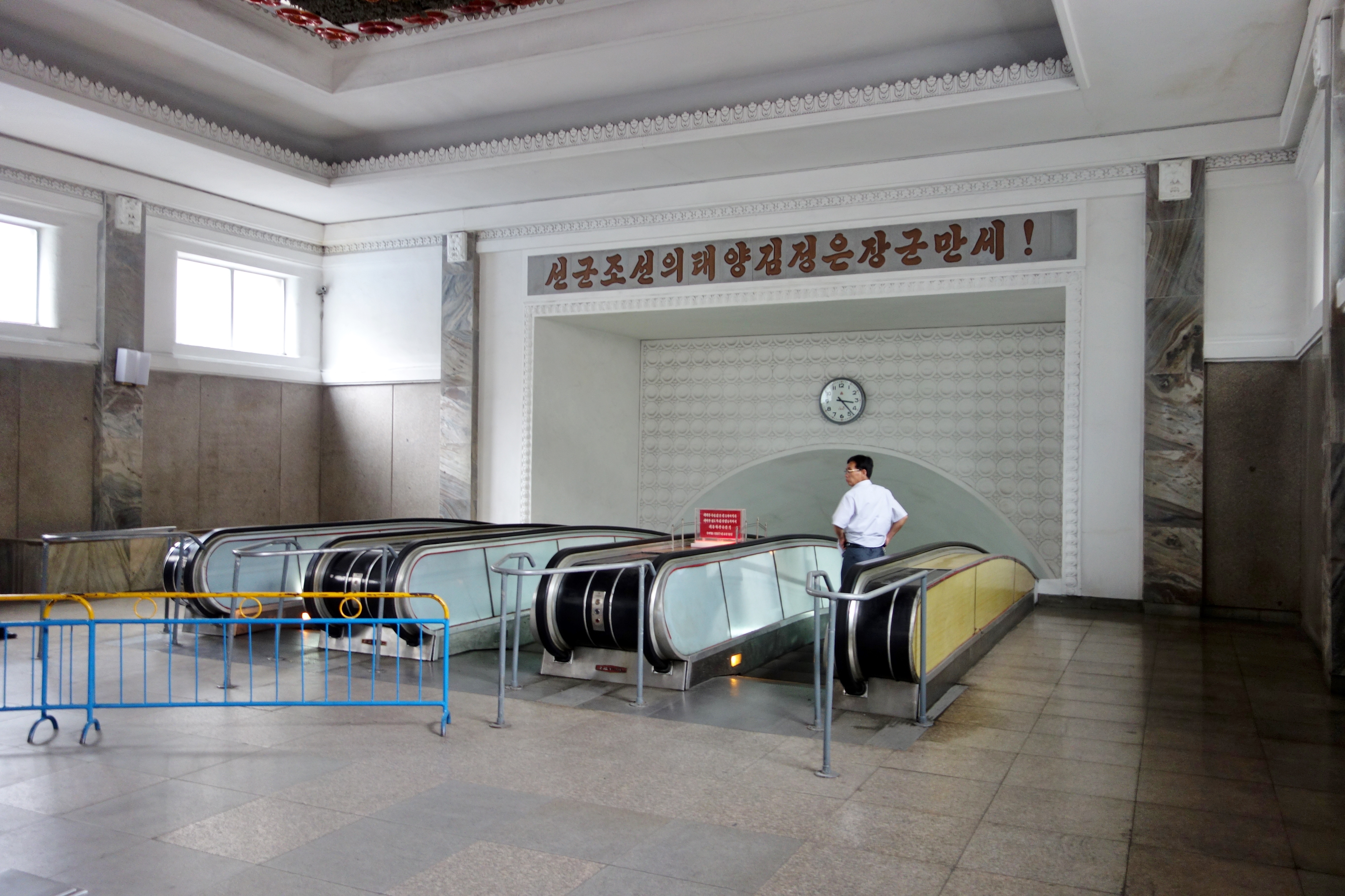 As the deepest metro system in the world, it is a long, long trip down to the trains. The subway stations in Pyongyang are designed to serve double-duty as nuclear bunkers should the need ever arise: