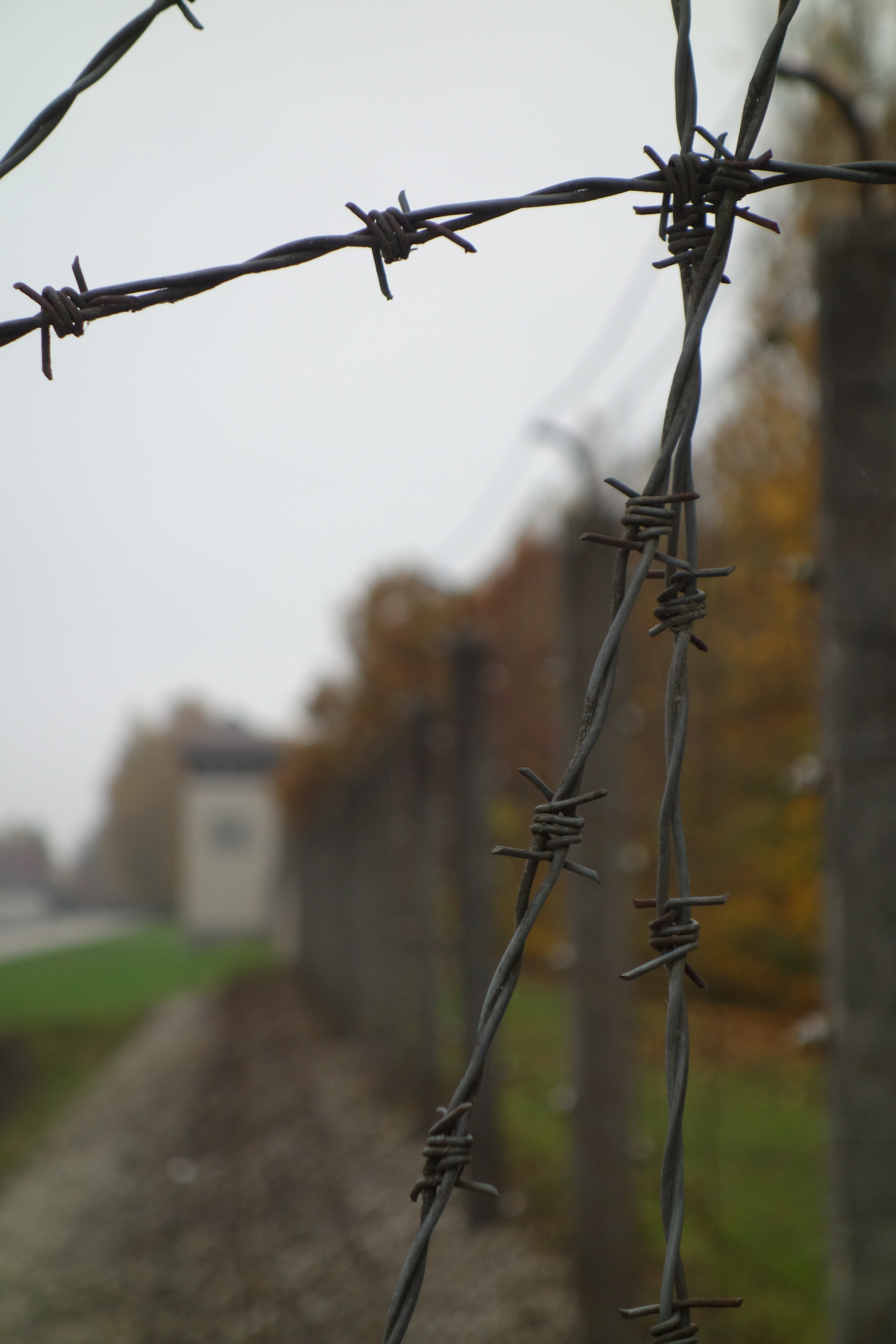 A guard tower is visible in the background along a perimeter fence of Dachau Concentration Camp: