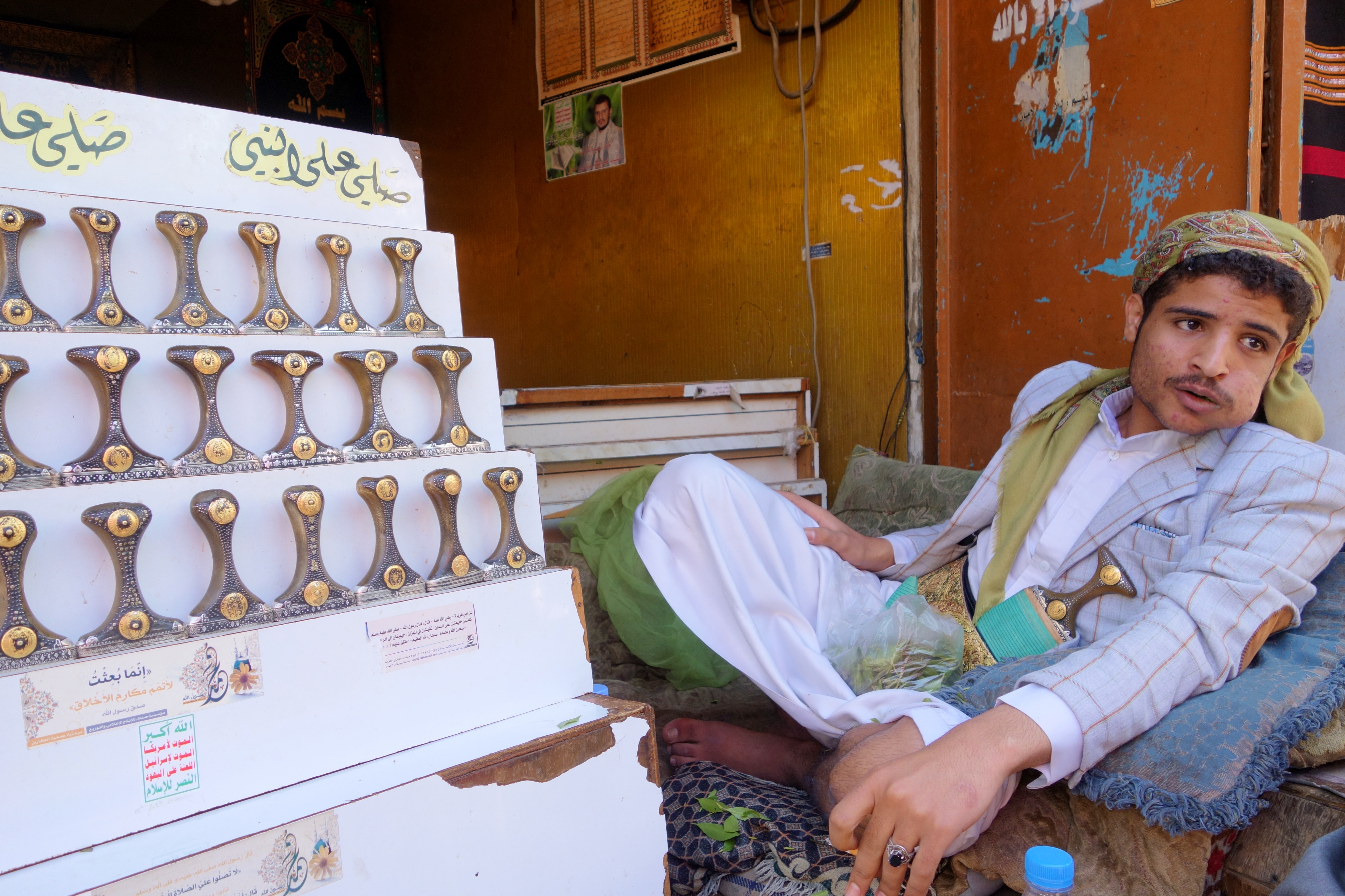 A man, his cheek bulging with khat, selling the traditional daggers of Yemen, the jambiya: