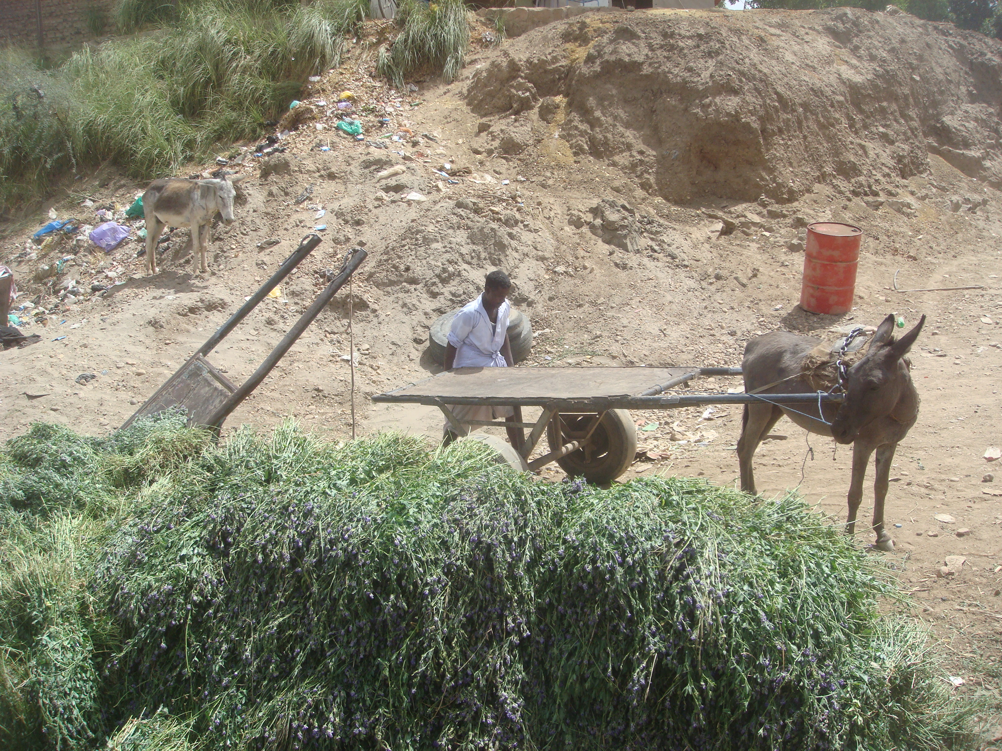 After the river plants have been washed and allowed to soak up as much water as possible, they are stacked on the back of these donkey carts and hauled off to street markets in the surrounding villages for sale: