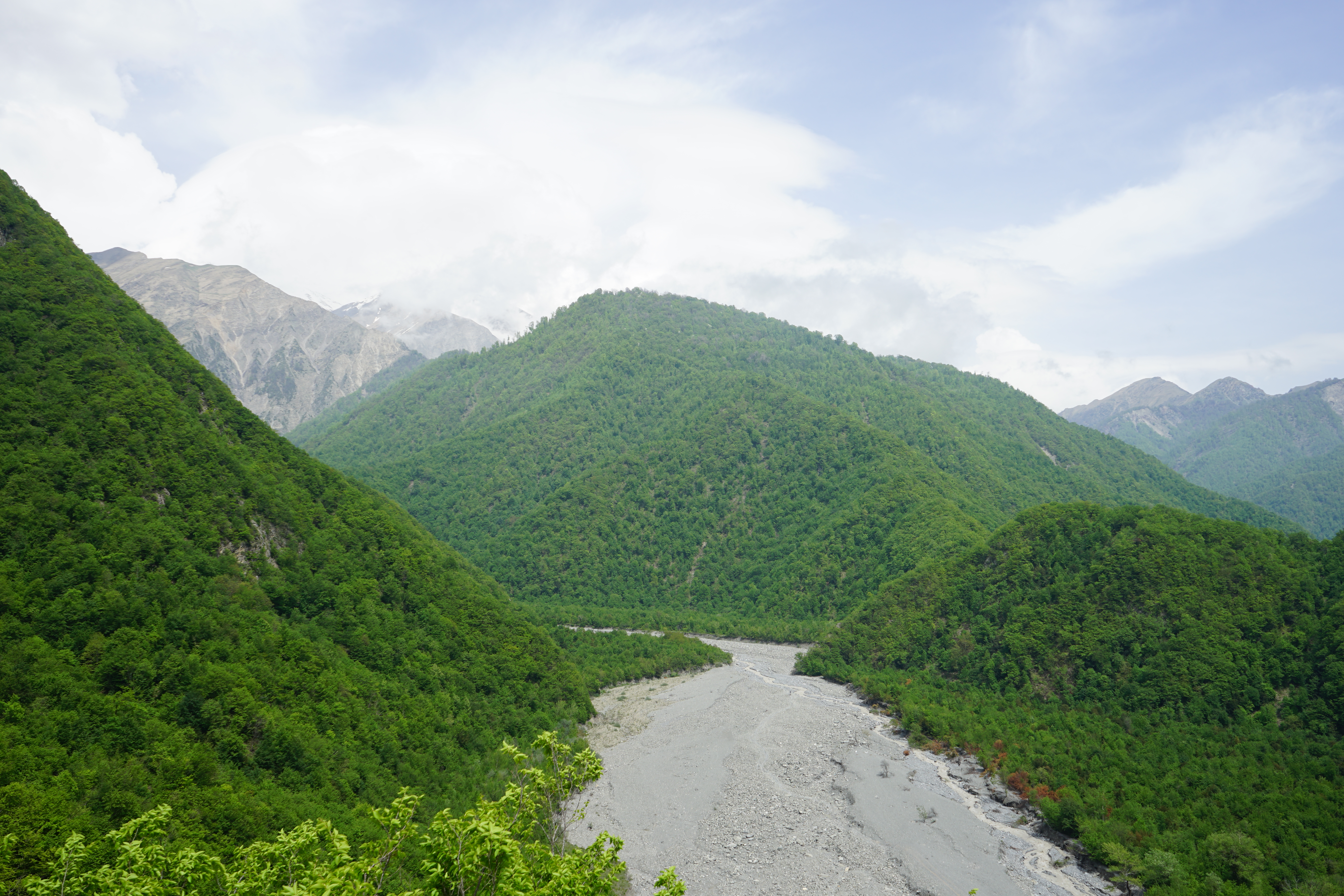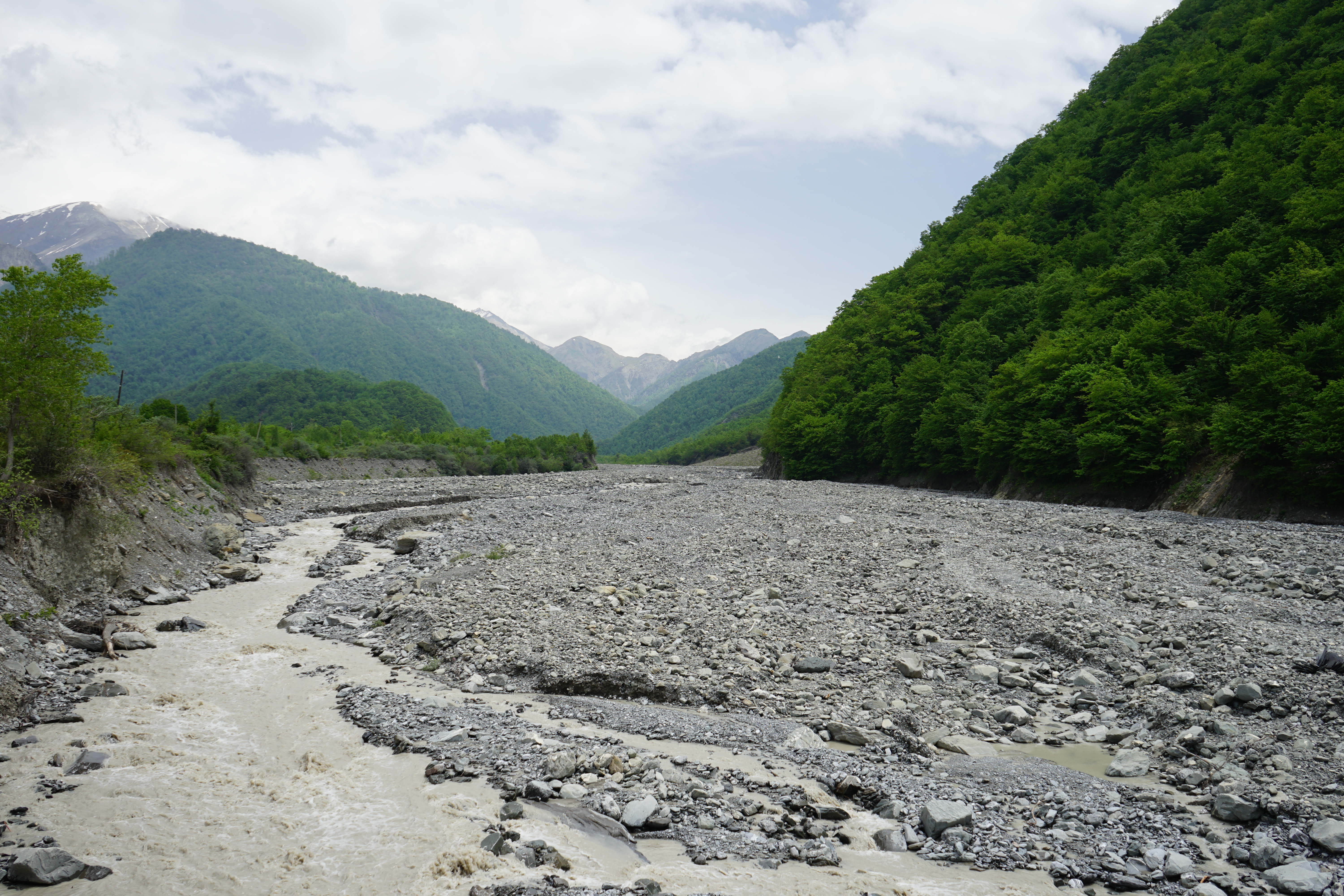 When you come to the fork in the dirt road pictured below, GO TO THE LEFT rather than to the right as we did. If you go to the right, you will find yourself abruptly walking into a military camp where you’ll meet surprised men with modern rifles that will be quite curious about you. The reason for their presence is that the river is a natural transportation corridor (which is also one reason the fortress was built above it) and just over the mountains that you see in the distance is the restive Russian Republic of Dagestan: